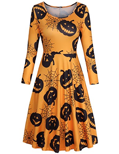 A-Line Dress,SUNGLORY Women's Long Sleeve Halloween Elements Print Pleated Swing Dress Yellow Pumpkins XXL