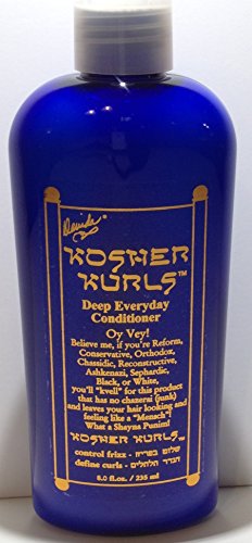 Product Description: Kosher Kurls Deep Everyday Conditioner Cleans curly or straight hair and is color safe. DIRECTIONS: Put a bisel (small amount) of Kosher Kurls Deep Everyday Conditioner on wet hair and schmooch it through. Let your hair kvell (enjoy) for this feeling and then rinse out. Follow up with Kosher Kurls leave-in schmear (conditioner). Perfect for Men, Women, Children, Schitels (wigs) and Peyot!Feature