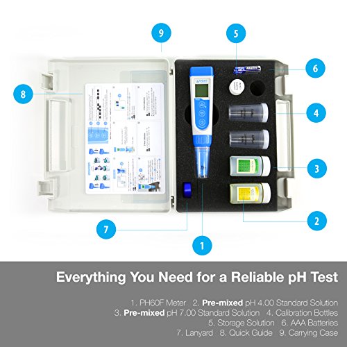 - COMPLETE Kit with READY-TO-USE calibration buffer solutions, calibration bottles, storage solutions, AAA batteries, and a lanyard all in a portable carrying case