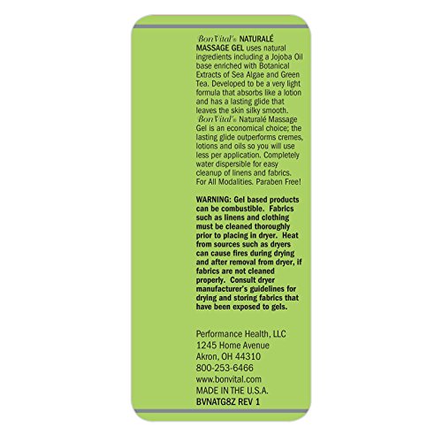 Studio : TheraBand Publisher : TheraBand Binding : Misc. Product Description Bon Vital´ Naturale Massage Gel - uses all natural ingredients including a Jojoba Oil base enriched with Botanical Extracts of Sea Algae and Green Tea. Developed to be a very light formula that absorbs like a lotion and has a lasting glide that leaves the skin silky smooth. Bon Vital´ Naturale Massage Gel is an economical choice; the lasting glide outperforms cremes, lotions and oils so you will use less per application. Completely water dispersible for easy cleanup of linens and fabrics. For All Modalities. 0