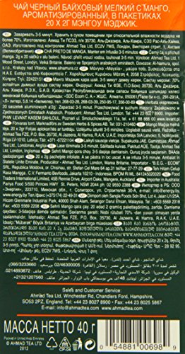 -. Binding : Grocery -. Brand : Ahmad -. EAN : 0054881006989 -. Feature : One of the best selling London collectable souvenirs / Beautifully made and very attractively presented / Ideal gifts for friends and family / Value for money / A recommended gift from London -. Label : Ahmad -. Manufacturer : Ahmad -. MPN : E451255H -. PackageQuantity : 1 -. PartNumber : E451255H -. ProductGroup : Grocery -. ProductTypeName : GROCERY -. Publisher : Ahmad -. Size : Single -. Studio : Ahmad -. Title : Ahmad Teas - Mango Black Tea 1.4oz - 20 Tea Bags -. UPC : 054881006989