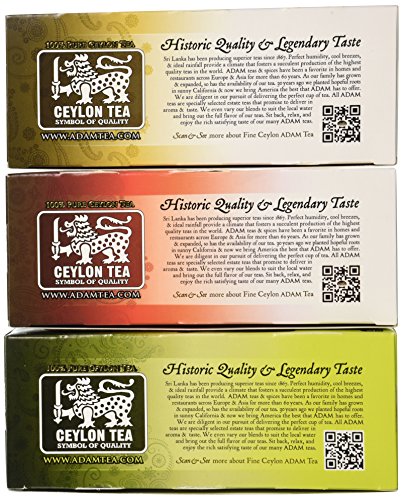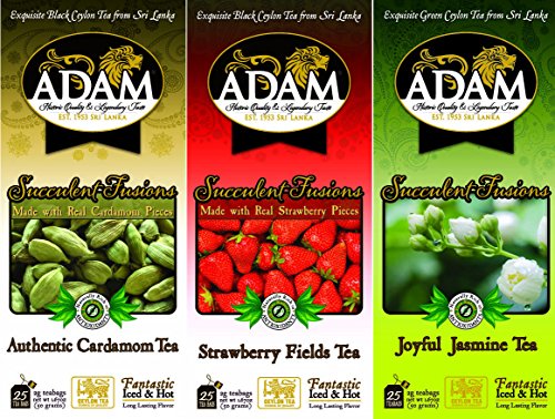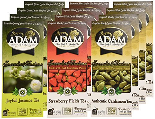 -. Binding : Grocery -. Brand : Adam -. EAN : 0815267021817 -. Feature : A wholesale combination case featuring 3 of our very popular spice teas / Authentic cardamom tea: Ceylon black tea flavored with real cardamom spice / Strawberry fields tea: Ceylon black high grown tea flavored with real strawberry pieces and natural strawberry flavor. / Joyful jasmine tea: pure Ceylon green tea flavored with real jasmine petals / This combination 12 pack contains 4 boxes of each of the above 3 teas, each box contains 25 individually wrapped teabags, 100 teabags of each tea, 300 teabags in all -. Label : Adam Expo -. Manufacturer : Adam Expo -. NumberOfItems : 1 -. PackageQuantity : 1 -. ProductGroup : Grocery -. ProductTypeName : GROCERY -. PublicationDate : 2015-10-26 -. Publisher : Adam Expo -. ReleaseDate : 2015-10-26 -. Studio : Adam Expo -. Title : Adam Tea Variety Pack, Cardamom/Strawberry/Jasmine -. UPC : 815267021817