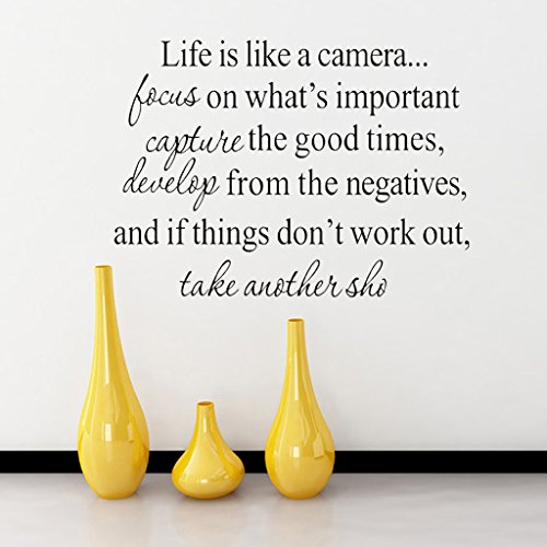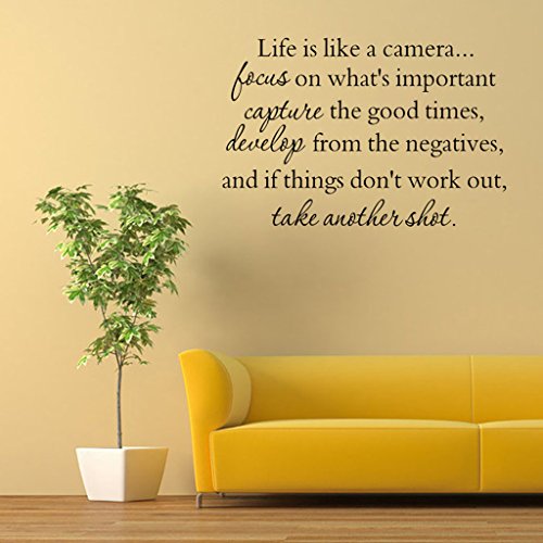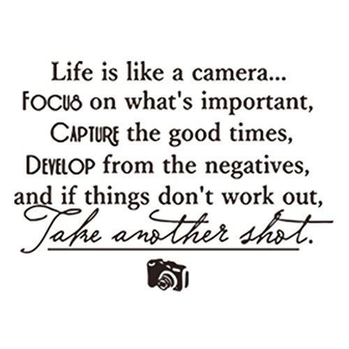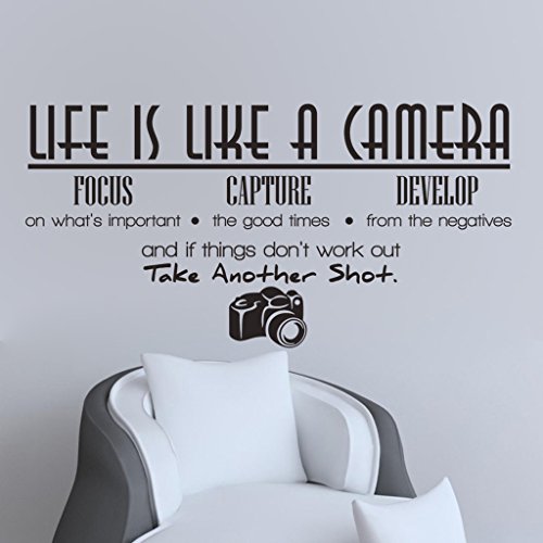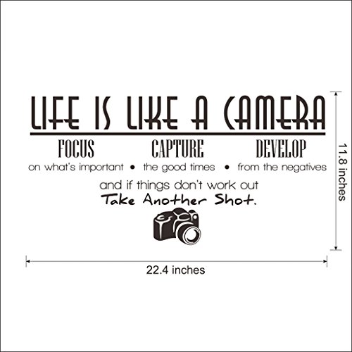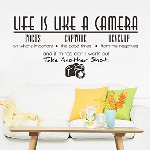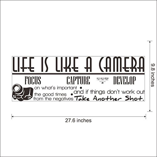 -. Binding : Kitchen -. Brand : Hi-Shop -. Feature : Easy to Apply and remove. / This decal is a wonderful addition to any room / Peel & stick; Remove in seconds without damaging your paint / Eco-friendly, non-toxic decals. / Please note that the black color is the default option, any other colors please leave us the message! -. ProductGroup : Home -. ProductTypeName : HOME -. Title : "Life is Like A Camera" Quote Decors Wall Saying Decals Quote for Home Wall Stickers Nursery Decor