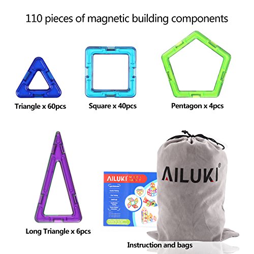 【110 PCS Magnetic Building Kits】40*square, 60*triangle, 6* long triangle, 4*pentagons, 1*storage bag,1*instruction booklet.