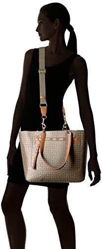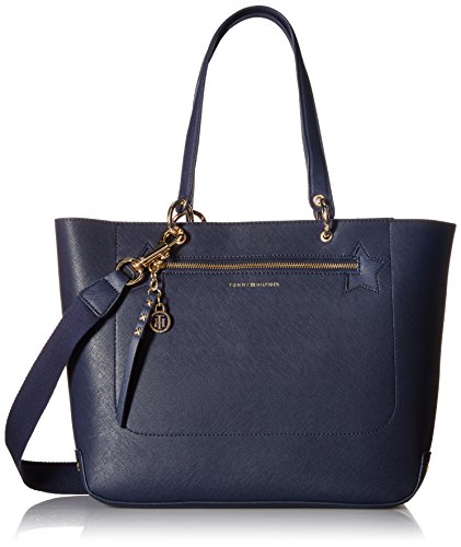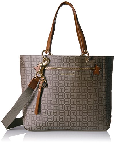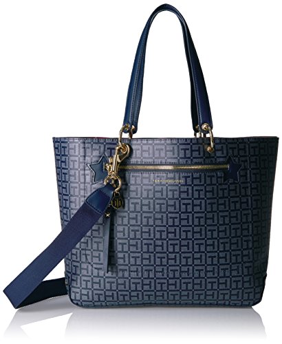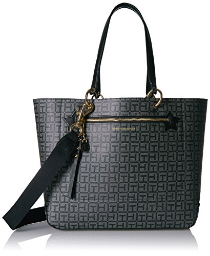 Travel tote bag for women featuring a coated woven th jacquard exterior, smooth to the touch. Printed interior pattern. This durable, water resistant bag fabrication will keep your tote bag free from stains. Exterior zipper with star studded zipper pull and th monogram charm. Flat bottom, double handles with convertible strap. Gold chain-link hardware details. Gold star studs at bottom side panels. This Tommy Hilfiger bag is a versatile essential, perfect for your next work tote. Our tote bag for women is a stylish addition to your collection of travel totes for weekend getaways. 18 length; 11-3/4 height; 5-1/2 width; 9-1/4/23-5/8 drop.