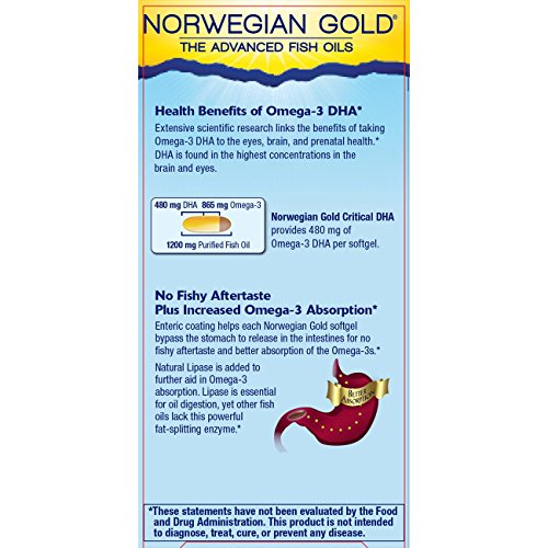 Norwegian Gold Critical DHA is an ultra-concentrated Omega-3 fish oil supplement high in DHA for those who want additional support for the brain, eyes, and prenatal health. With over 80% total Omegas, it contains 480 mg Omega-3 DHA in each burp-free softgel to help give your body what it might be missing. These statements have not been evaluated by the Food and Drug Administration. This product is not intended to diagnose, treat, cure, or prevent any disease. * These statements have not been evaluated by the Food and Drug Administration. This product is not intended to diagnose, treat, cure, or prevent any disease.Feature