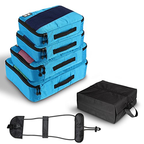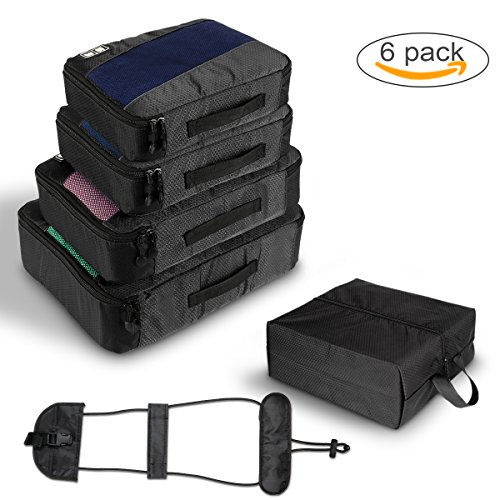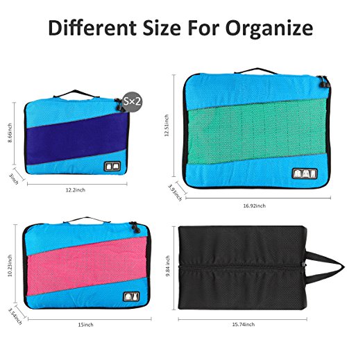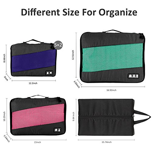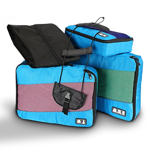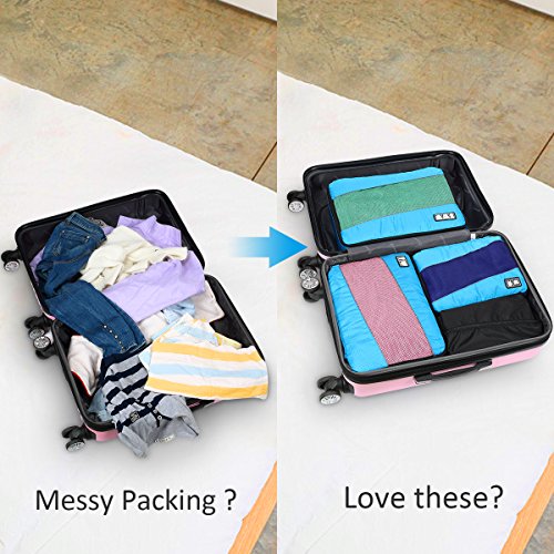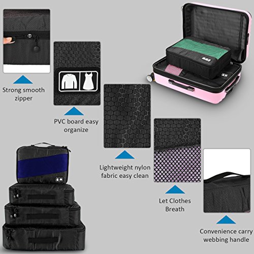 1.Different sizes to easy use 2.Top mesh panel for ventilation and easy identification of contents 3.Double and smooth zippers for easy to insert and remove your items 4.Each packing cube comes with a webbing handle for easy grabbing, carrying separately, or hanging 5.Made with quality polyester. Build to prevent water from entering or passing through. No need to worry about the water damage wherever you bring 6.Special pvc indicator board design. Easy for reorganization and pull out from luggage, instead of emptying everything out to find messy 7.Microfiber Nylon Plastic strong bungee