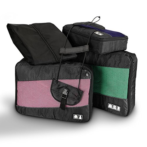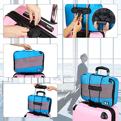 1.How to organize for the cubes? By rolling items rather than folding.Organize clothing into different bags and then lay the bags into the suitcase. Why you need the Add A Bag Strap? 1.Let the big pad of the bungee goes over the handle of the suitcase and hangs down over the top of the suitcase. 2.Place your backpack on top of the cords and against the handle of your suitcase. 3.Take the front part of the bungee and stretch it over your backpack and over the suitcase handle. Adjust the elastic cords to hold it tight. May be you can find more fun use way on net.