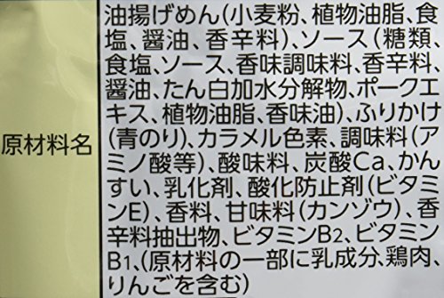 원재료:유부 면(소맥분,식물성 기름지,식염,간장,향신료)고, 소스(당류,식염,소스,향기 맛 조미료,향신료,간장,단백 가수분해물,포크 엑기스,식물성 기름지,향기 맛유)고, 뿌리다(파래)고, 카라멜 색소,조미료(아미노산등)고, 신맛료,탄산Ca,물어 들이마시고, 유화 제,산화 방지제(비타민E)고, 향료,감미료(캔 코끼리)고, 향신료 추출물,비타민B2,비타민B1,(원재료의 일부에 유성분,닭고기,사과를 포함한다)