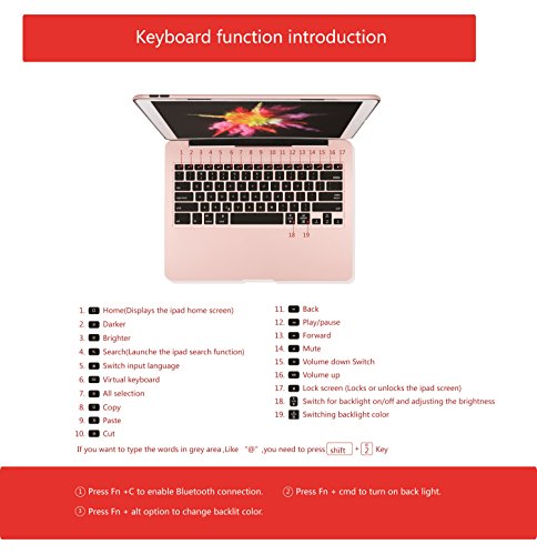 - KEYBOARD FEATURES: Auto hibernation. 7 colors adjustable brightness LED backlit. Full size keyboard with scissor cut keys which provide typing experience just like on laptop. 17 shortcut keys allow you control your ipad volume up/down, adjust screen brightness, open search function, select typing language, copy, paste or cut sentences, lock iPad screen with just one button click.