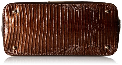 -. Feature : Zip-top dome satchel featuring reptilian-textured leather, footed bottom, removable shoulder strap, and logoed charm