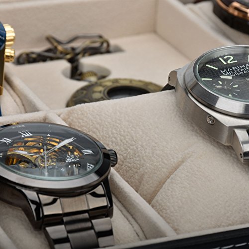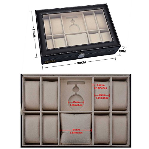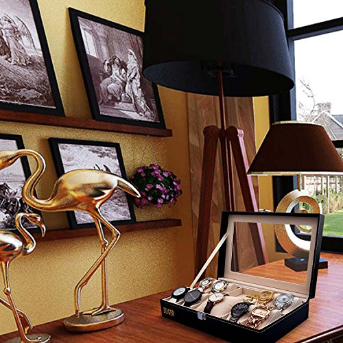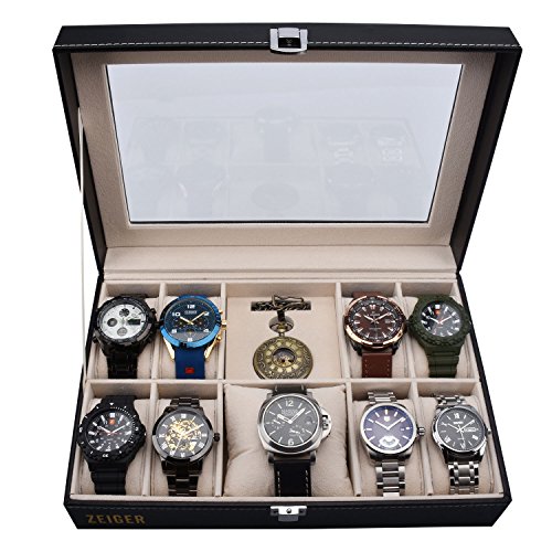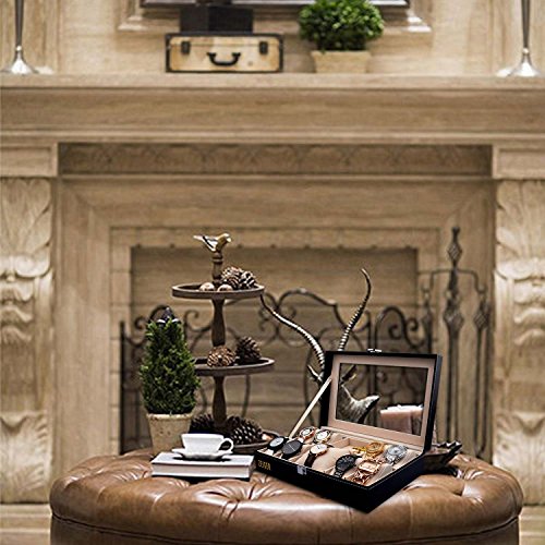 Zeiger Mens Women Jewelry Watch Storage Display Box Upgrade Large Holder Decorative Faux Leather Watch Case and Glass Top 10 Slot Organizer S001 Black Christmas Gift