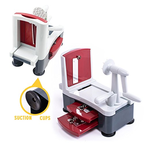 - ❤ TOP QUALITY & DESIGN: 420 High Carbon Cutlery Grade Stainless Steel Blades ensure vegetable slicer longevity for everyday usage. 100% without BPA food grade, durable reinforced ABS plastic. Four powerful suction feet for stability with easy-release tabs. It can be attached to any flat and smooth surface. Convenient installation and Small footprint with a built-in storage compartment for holding blades.