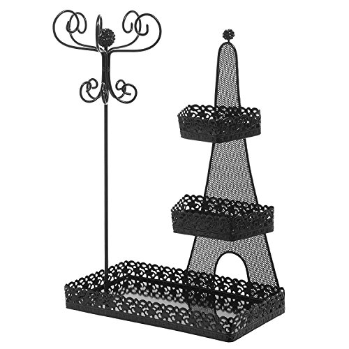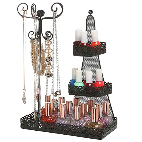 Show off and store your makeup and jewelry in style with this beautiful organizer rack. With 3 metal tiers and a 10-hook jewelry hanger, this dresser top storage rack is a wonderful way to keep your home, store, or salon well organized. Best of all, this organizer rack boasts a classic black finish and an elegant scrollwork design that will fit in beautifully with any decor. Ready to bring style and storage to your space? This lovely cosmetics organizer is just what you need. *Due to monitor variations colors may appear slightly different.*