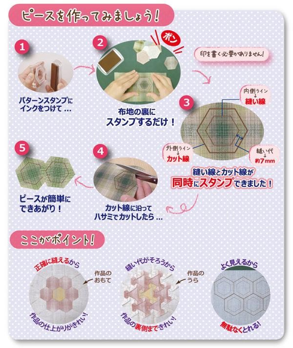 くり返し使える便利なパターンスタンプです。布地にスタンプするだけで、パターンと縫いしろの印つけを同時にできます。手作業に比べて正確でスピーディー!!本体が透明でグリッド入りなので布の目や柄が見やすく、位置決めしやすいです。 |