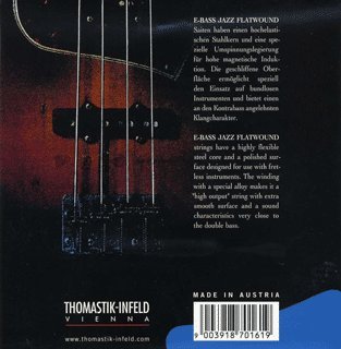 Studio : Thomastik Publisher : Thomastik Product Description Jazz Bass Series Strings from Thomastik-Infeld offer you extended durability and high output. A highly flexible steel core gives the string a balanced feeling and a special character. The overall sound characteristics can be described as very close to the double bass. Nickel flatwound with a round core. 32" scale.Gauges: .043-.056-.070-.106.. 0