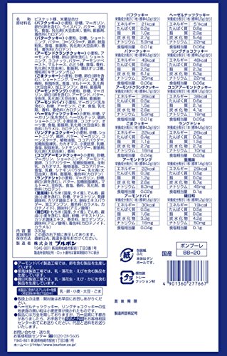 原材料:【パフクッキー】小麦粉、砂糖、マーガリン、卵白(卵を含む)、ライスパフ、バター、全粉乳、食塩、乳化剤(大豆由来)、香料、膨脹剤、着色料(カロテン)乳化剤(大豆由来)、香料、膨脹剤、着色料(カロテン)【バタークッキー】小麦粉、砂糖、ショートニング、バター、コーンスターチ、鶏卵、脱脂粉乳、食塩、膨脹剤、乳化剤(大豆由来)、香料、着色料(カロテン)膨脹剤、乳化剤(大豆由来)、香料、着色料(カロテン)【アーモンドクランチクッキー】小麦粉、アーモンド、砂糖、卵白(卵を含む)、ショートニング、ココナッツ、バター、アーモンドペースト、マルトース、ぶどう糖、食塩、香料、乳化剤(大豆由来)、膨脹剤、環状オリゴ糖、増粘剤(キサンタンガム)香料、乳化剤(大豆由来)、膨脹剤、環状オリゴ糖、増粘剤(キサンタンガム)【ごまクッキー】小麦粉、砂糖、卵白(卵を含む)、ショートニング、マーガリン、ごま、寒梅粉、脱脂粉乳、食塩、マルトース、乳化剤(大豆由来)、加工デンプン、香料、膨脹剤乳化剤(大豆由来)、加工デンプン、香料、膨脹剤【アーモンドラング】小麦粉、砂糖、マーガリン、卵白(卵を含む)、アーモンド、バター、全粉乳、乳化剤(大豆由来)、香料、膨脹剤乳化剤(大豆由来)、香料、膨脹剤【アーモンドパイ】小麦粉、マーガリン(乳を含む)、砂糖、アーモンド、ごま、食塩、乳化剤、香料、着色料(カロテン)乳化剤、香料、着色料(カロテン)【ヘーゼルナッツクッキー】小麦粉、砂糖、マーガリン(乳を含む)、ヘーゼルナッツ、鶏卵、ショートニング、小麦胚芽、ココナッツ、オーツ麦、食塩、膨脹剤、乳化剤(大豆由来)、着色料(カラメル、カロテン)、香料膨脹剤、乳化剤(大豆由来)、着色料(カラメル、カロテン)、香料【リングチョコクッキー】小麦粉、砂糖、ショートニング、鶏卵、バター、マーガリン、コーンスターチ、植物油脂、ココアパウダー、加糖脱脂練乳、カカオマス、小麦胚芽、乳糖、食塩、脱脂粉乳、シナモンパウダー、膨脹剤、乳化剤(大豆由来)、香料膨脹剤、乳化剤(大豆由来)、香料【ココアアーモンドクッキー】小麦粉、砂糖、マーガリン、ショートニング、アーモンド、鶏卵、ココアパウダー、加糖脱脂練乳、全粉乳、カカオマス、植物油脂、ココアバター、食塩、乳糖、シナモンパウダー、乳化剤(大豆由来)、香料、膨脹剤、着色料(カロテン)乳化剤(大豆由来)、香料、膨脹剤、着色料(カロテン)【ラングドシャ】小麦粉、マーガリン、砂糖、卵白(卵を含む)、バター、加糖脱脂練乳、マルトース、全粉乳、食塩、香料、乳化剤、着色料(カロテン)香料、乳化剤、着色料(カロテン)【里風味】もち米(国産、タイ産)、でん粉、醤油(小麦を含む)、砂糖、デキストリン、発酵調味料、カツオ調味エキス、酵母エキスパウダー、加工デンプン、着色料(カラメル、カロテノイド)、調味料(アミノ酸等)加工デンプン、着色料(カラメル、カロテノイド)、調味料(アミノ酸等)【磯日和】もち米(国産、タイ産)、でん粉、醤油(小麦を含む)、海苔、砂糖、デキストリン、カツオ調味エキス、香辛料、加工デンプン、調味料(アミノ酸等)、着色料(カロテノイド、カラメル)加工デンプン、調味料(アミノ酸等)、着色料(カロテノイド、カラメル)
