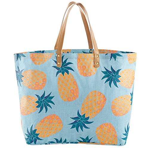 Jute tote features all-over fruit print with vegan leather handles.