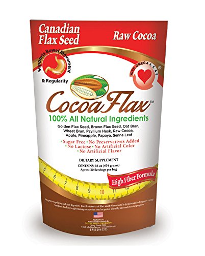 -. Feature : 1 pound bag of CocoaFlax. Approx. 30 servings per bag. / All natural ingredients, including Canadian Flax seed, Raw Cocoa, Apple Fiber, / Psyllium Husk, Oat Bran, Omega 3,6,& 9, B Vitamins and much more. / Take 2 tablespoons of CocoaFlax in 8 oz. of your favorite juice or milk everyday / before breakfast or after dinner. It supports bowel movement and regularity.