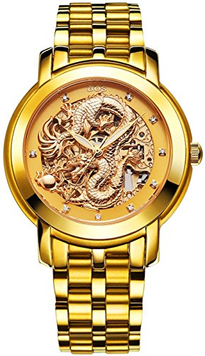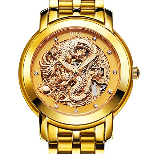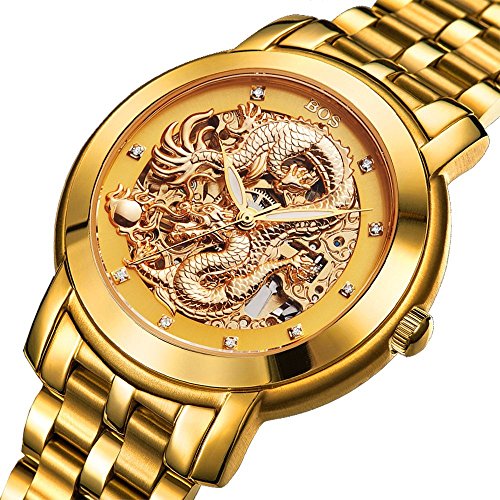 -. Title : BOS Men's 'Dragon Collection' Luxury Carved Dial Automatic Mechanical Bracelet Waterproof Gold Watch 9007
