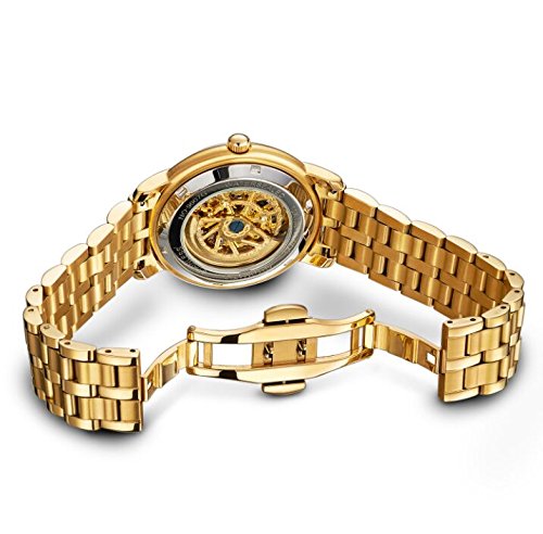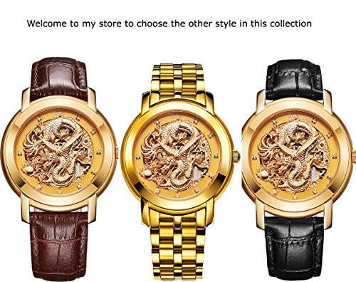 -. Feature : High quality Automatic self - wind mechanical movement / Special Chinese Dragon Design, very details carving, no Scratches, shiny finish / Protective Synthetic-sapphire crystal dial window / Water resistant to 330 feet (100 M),Withstands rain and splashes of water / 316 Stainless Steel gold plated case and gold plated stainless steel bracelet band. Come with the gift box and bag, free tool for adjust the metal links.