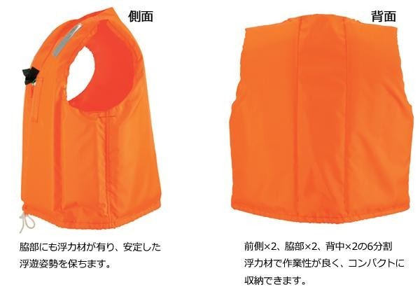 船舶検査対応OK、定番のチョッキ式ライフジャケットです。脇部にも浮力材が有り安定した浮遊姿勢を保ちます。前側×2、脇部×2、背中×2の6分割浮力材で作業性が良くコンパクトに収納できます。 |