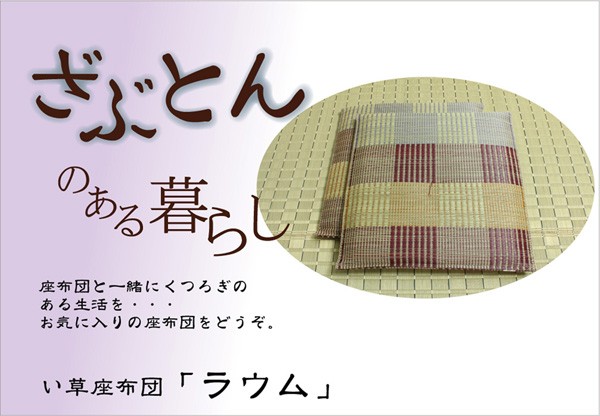 柔らかい肌感触のイ草座布団です。メセキ織という技法で柔らかい肌感触に仕上げました。国産(九州産)のい草を使用しています。一本一本が太く、表皮が厚く繊維がキメ細かいので弾力性があり、耐久性に優れています。い草には空気の自然浄化作用、湿度の調節作用などがあります。また汚れにくく、使用するうちに黄金色に変化し味が出ます。い草に青森ヒバ加工を施しています(抗菌、防臭効果)。中材はウレタンをポリエステルわたでサンドした三層構造で、適度なクッション性があります。