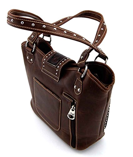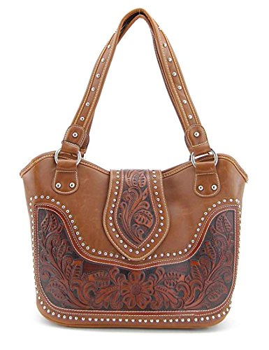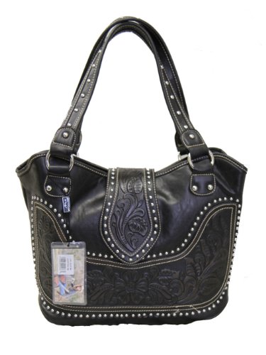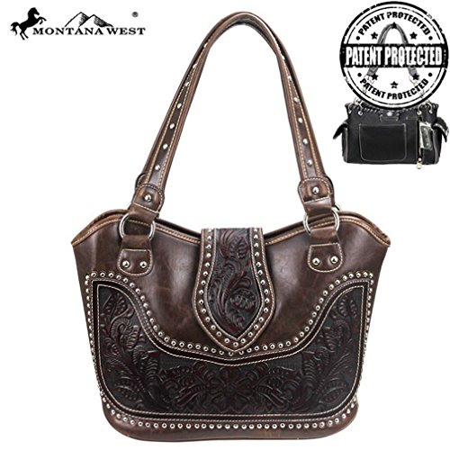Product Description You will love the authentic, classy look of this genuine leather bucket bag from Montana West! This popular Western Style Concealed Weapon Handbag has a beautiful tooled design and silver tone stud accents. This top opening bag has zipper closure and a flip over snap closure. The fully lined interior has 2 compartments separated by a center zipper compartment. The front wall has 2 slip pockets and the back wall has a zipper pocket. The back of the bag has an open pocket and the concealed weapon pocket which has vertical zipper access. PLEASE NOTE: The concealed weapon pocket DOES have a barrel rest. The dust bag is also included. 0