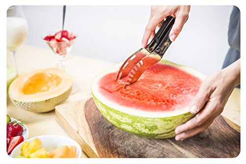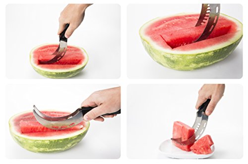 -. Feature : ✔ 2 IN 1 FUNCTIONALITY: Quickly & easily slice up fresh watermelon or cantaloupe into smooth, even slices-without getting the juice & pulp all over your table. No sharp blades so you won't cut yourself. Doubles as a server, too! / ✔ COMFORT & QUALITY: Not all watermelon slicers were created equal. The grip handle of our slicer is long enough for your entire hand to hold it- other slicers have smaller grips, too small for holding it comfortably (Just compare the pictures). Made of durable, premium-grade stainless steel with a sturdy, black non-slip grip. Use again and again-it won't rust or tarnish, and it's dishwasher safe! / ✔ PERFECT FOR PARTIES: Impress your friends & family by slicing & dicing an entire melon in just minutes. You'll want one for cookouts, backyard BBQs, birthday parties & more. Kid-friendly. / ✔ BONUS SET OF FRUIT FORKS: Includes 4 FREE stainless steel fruit forks that are perfect for appetizers, dessert, tasting parties & fondue. More attractive & eco friendly than toothpicks. / ✔ A UNIQUE, USEFUL GIFT: This is a gift everyone will appreciate! Buy it for a housewarming party, wedding or bridal shower-or surP.R.Ise your hostess, wife or mom with a truly practical gift.