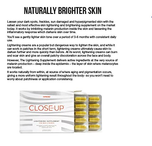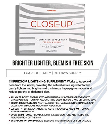 -. Feature : HOW IT WORKS. More effective than simply plain Glutathione, we've selected the most proven ingredients that lighten skin, from inside the cell. Melanin Inhibitors like Liquorice, Pomegranate and Pine Bark Extract. Hyperpigmentation removers from Antioxidants L-Glutathione and Curcumin. And "Natures Hydroquinone" - Uva Ursi. / SAFER THAN OTHER TREATMENTS: Bleaching + chemical treatments are harsh and toxic while lightening creams can create patches, and damage skin in the long term. Our skin whitening pills target EVERY single cell evenly through your body, for a more permanent, safe result. / ALL TYPES OF BLOTCHY SKIN: UV Damage, Melasmia from pregnancy hormones, freckles, age spots, Ochronosis, dark and discoloured. If your skin fits any of those descriptions, we made this supplement for you. / PREMIUM INGREDIENTS: Manufactured in the UK. Each ingredient is active and natural. No binding or bulking agents, additives or preservatives. Free from: Gluten, Yeast, Dairy, GMO, and Soy. Just bright skin ingredients. / ORDER NOW: Permanent, corrective skin lightening does take time, but your results will be outstanding! If CORREXIKO's Skin Lightener has not given you brighter skin after the recommended time - please return for a full refund. No questions asked. Order yours today.