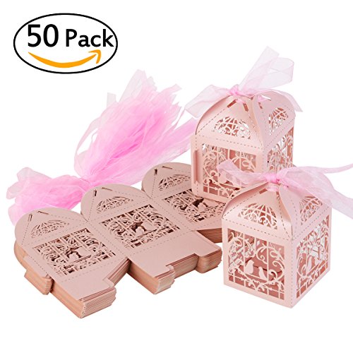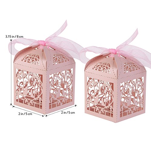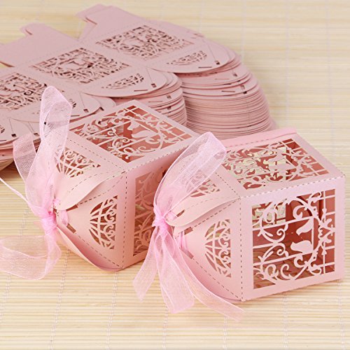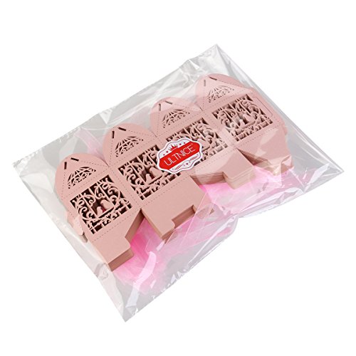 ULTNICE 50pcs Hollow Wedding Favor Candy Chocolate Gift Boxes with Ribbons for Wedding Engagement Party Pink