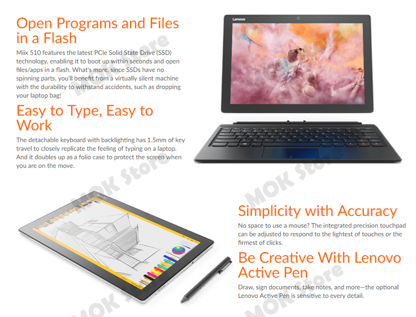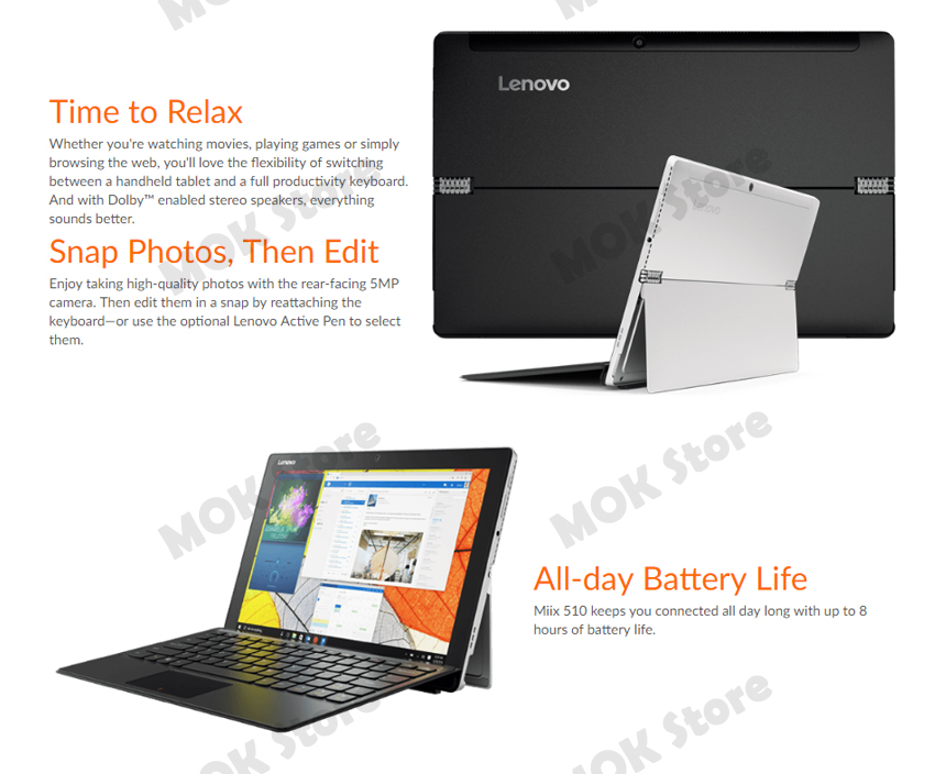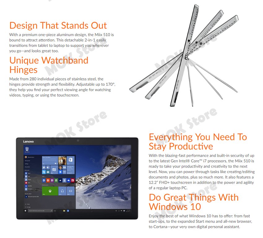- The 12.2" Miix 510 Multi-Touch Notebook from Lenovo meets your ever-changing computing needs by coming with an Intel Core i3-6100U processor encased in a 2-in-1 design that provides a detachable keyboard and a watchband hinge. This design provides you with a notebook form factor for typing emails and reports as well as a tablet mode for reading your favorite books or drawing illustrations using an optional Lenovo Active Pen. Lenovo has outfitted the Miix 510 with a 12.2" touchscreen that sports a resolution of 1920 x 1200, utilizing an Intel HD Graphics 520 chipset. For system performance, this tablet comes armed with 4GB of 2133 MHz DDR4 RAM and a 128GB SSD that sports a PCIe interface, which delivers data faster than a SATA connection. Additionally, Windows 10 Home is installed on this drive to support the multi-touch features of the display.