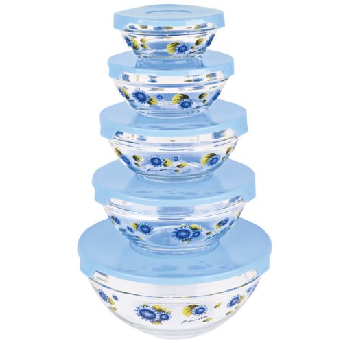 Floral glass bowls with lids help you serve and store in style. 5-pc floral glass bowls with pretty patterns and color coordinated lids are both functional and festive. Each serving bowl features its own snap-on lid. Five bowl set includes bowls ranging from 6 oz. (3 1/2" diameter x 1 1/2" high) to 32 oz. (6 3/4" diameter x 3" high) capacity. Serving bowl set is dishwasher, microwave, refrigerator and freezer safe.Feature