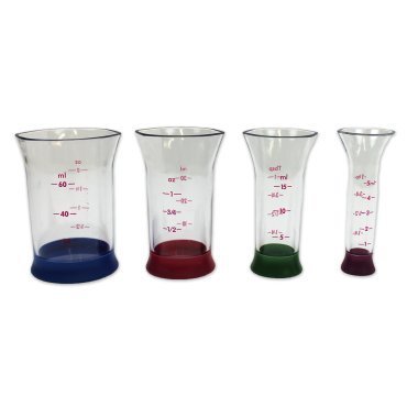 - Set includes: 1 tsp (blue), 1 Tbsp (purple), 1 ounce (green), and 2 ounce (red) beakers