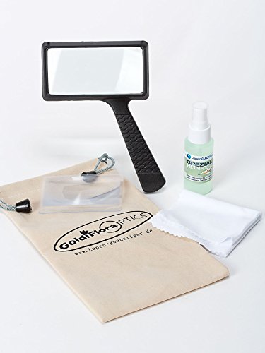 -. Feature : Eine sehr stabile Lese/Handlupe - Liegt sehr gut in der Hand - Ideal als Sehhilfe für Senioren - / Sehr grosser Linsendurchmesser - 10cm auf 5cm ( LxB ) - mit hochwertiger Glaslinse / Eine sehr gutes Vergrößerungsglas für Alltag, Beruf und Hobby ( z.B. Briefmarken/Münzsammler, Zeitung lesen ) / 2x fache Vergrößerung - mit Glaslinse - Lupengewicht - ca.150g - BESTSELLER LUPE / mit viel kostenfreiem Zubehör - inkl. 1x MIKROFASERTUCH - inkl. 1x Flasche Linsenrein. 30ml - inkl. 1x Scheckkartenlupe (Fresnelllinse) - (2x Vergrößerung) - inkl. 1x Stoffbeutel -