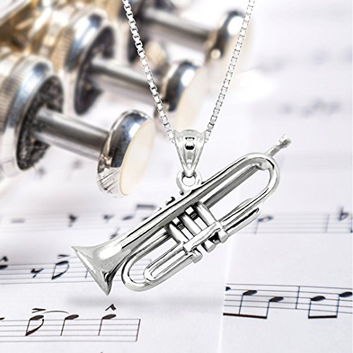 Sterling silver trumpet bugle necklace pendant. Comes with a 16"-18" adjustable box chain. Gift box included. From Honolulu Jewelry Company, Honolulu, Hawaii.