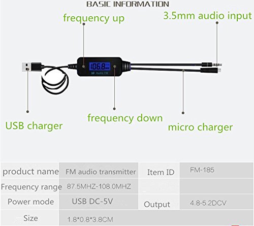 Studio : baile Publisher : baile Binding : Electronics Product Description Baile design and manufacture all kinds Consumer electronics,such like car charger,bluetoothe receivertransmitter.we have R D team and factory,we provide high quality products and best service.FM185 is a fm transmitter without bluetooth,it use PLL phase-locked loop technology make your audio sound high quality effect.large LCD screen use less power and display frequency info clearly.full frequency from 87.5-108MHZ,each 0.1MHZ make it possible to find the exact frequency you want.momery function avoid adjusting again. How to use: First plug the male USB into a car with a female 5V USB port for power supply of FM-185, at the same time by Micor USB for power charging of Audio/Video products .through to adjust the transmitting frequency, in order to achieve the best playback. Insert into the headphone port for audio and video products for audio (such as music/storytelling) output to FM-185 and the sound transmitted through the (1) Short pressing the button ,frequency will automatically increases 0.1MHz. Long pressing the button , will continuous increasing the frequency by 0.1MHz. Short pressing the button,frequency will automatically decreases 0.1MHz. Long pressing the button , will continuous decreasing the frequency by 0.1MHz. You can choose the frequency between the 87.5~108.0 to achieve the best sound reception quality.?? ? (2)Plug into the headphone port of portable audio/video player, enable audio signal output to FM-185 for transmission. (3)Plug into corresponding female Micor USB , enable you for power charging of your audio/Video products, so you can enjoy music on the side while charging? your portable player on the other, keep it at energy saturation. ? Package content: 1 x FM transmitter 1 x User manual
