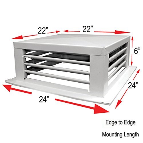 Product Description White Powder Coated 4-Way Adjustable Metal Diffuser for Evaporative/Swamp Cooler, Cover Hole Size 22" x 22". - White powder coated metal - Body dimension: 22"W x 22"L x 6"H - 1" width edge at the end of the body for easy installation. See image for details. - 4-way adjustable. 0