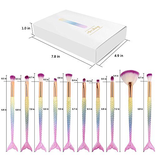 100% Brand New 10pcs Mermaid Makeup Eye Brush Set. High density soft nylon bristles, premium plastic handles, fancy gradient colors, stylish exquisite gift packaging, ideally to used as gift to your friends and families. Include 10pcs different kinds of eye brushes, perfect for create a beautiful smoky eye looks or other eye makeup applications. Features: Material: soft nylon bristles, aluminum tube premium plastic handles