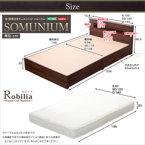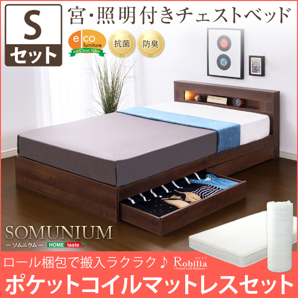 宮、照明付きチェストベッド【ソムニウム-SOMUNIUM-(シングル)】(ロール梱包のポケットコイルスプリングマットレス付き)