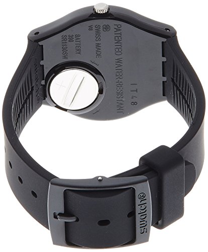 Swatch GB247R Originals Black Suit men's watch features a 34mm wide and 9mm thick black plastic case with a fixed bezel and textured push-pull crown. Swatch GB247R is powered by a reliable Swiss quartz movement. This stylish watch also features a sharp looking black dial with white accents black luminous hands and Arabic numeral hour markers, scratch resistant acrylic crystal and water resistant to 30 meters. Swatch GB247R is equipped with a 19mm wide black silicone rubber strap with a buckle clasp. Swatch GB247R men's Originals Black Suit black dial black silicone strap watch is brand new and comes in an original Swatch gift box and is backed by a 2 year store limited warranty.Feature