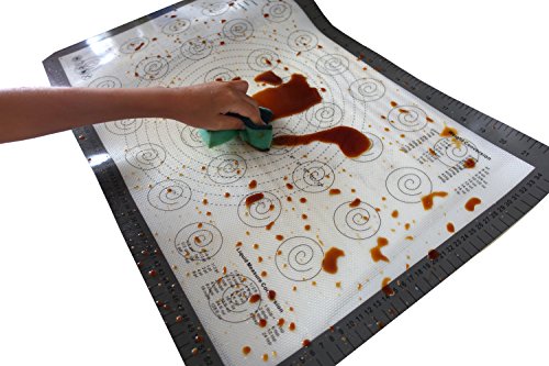 Food-Grade Silicone Made from durable, food-grade silicone that can be reused over and over, the flexible baking mats feature a nonstick surface that allows for effortless food removal. No extra greasing needed. Use the silicone mats when baking chocolate-chip cookies, cinnamon buns, or homemade bread or when making sticky caramels or baked salmon with garlic and lemon. The mats also work well for placing under bubbling casseroles or fruit pies that drip over, catching drips and preventing a messy oven, dirty pan, or the need for disposable aluminum foil. And unlike other types of pans and baking sheets, the non-stick baking mat can handle the use of metal spatulas or utensils without damage (serrated edges not recommended).