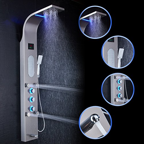 ELLO&ALLO LED Shower Panel Tower System, Rainfall and Mist Head Rain Massage Stainless Steel Shower Fixtures with Adjustable Body Jets, Brushed Nickel