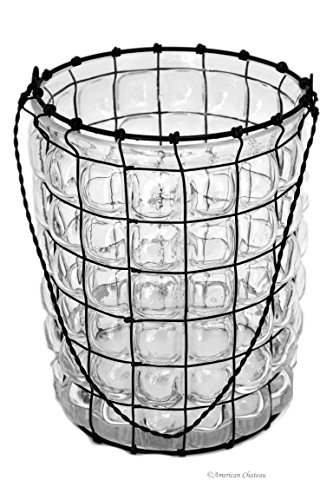 -. Feature : Indoor/Outdoor Lantern / Clear Hand Blown Glass encased in Wire Cage / Cylinder Shaped with Hobnail Style Glass / Metal Wire Handle / Approximate Size: 6.75" x 5" x 5"