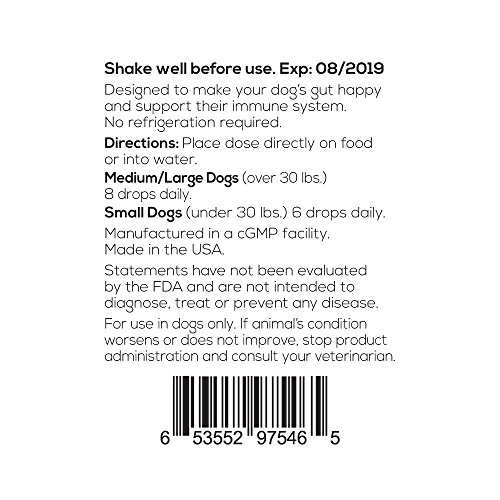 Suggested Use: Place dose directly on food or into water. Medium/Large Dogs (over 30 lbs.) 8 drops daily. Small Dogs (under 30 lbs.) 6 drops daily.