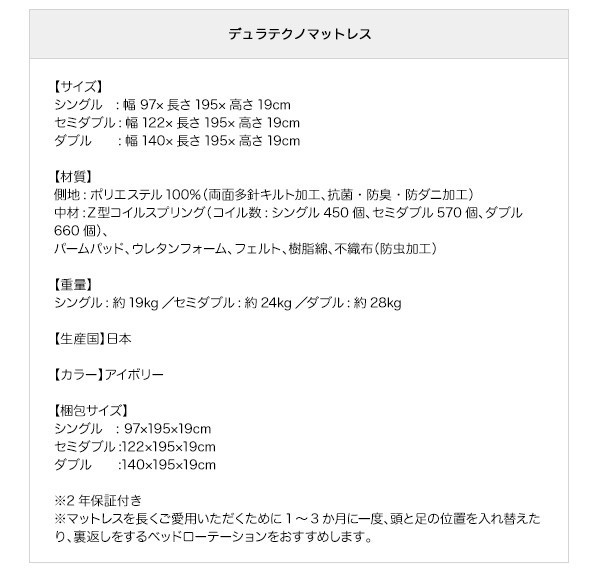 中材:Z型コイルスプリング(コイル数:シングル450個、セミダブル570個、ダブル660個)、パームパッド、ウレタンフォーム、フェルト、樹脂綿、羊毛綿、不織布(防虫加工)