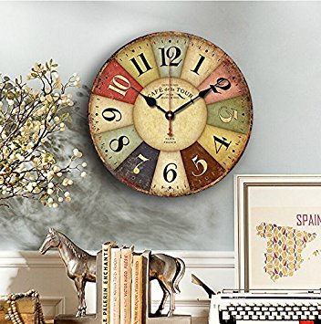 - PERFECT ALL-MATCH DECORATION:French Paris Country Tuscan Style,Rustic Vintage Retro Wooden wall clock with a colorful nice looking face,the colors match pretty with any decor scheme, coordinate with furniture,it goes really well with family room,living room,bedroom,kitchen,bathroom,office,dining room,sewing room or any wall of any color.It is not only a decorative wall clock,but also a great gift choice for your friends and your family.