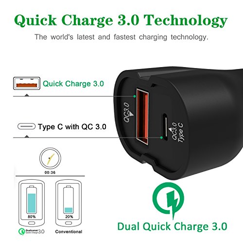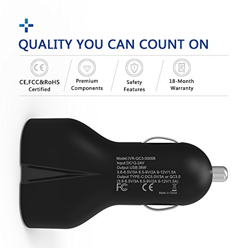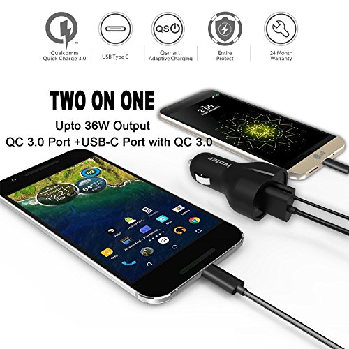 -. Feature : Universal Charging - Powerful 36W 2 Adaptive Ports (Output:5-6.5V/3.0A, 6.5-9V/2.0A, 12V/1.5A) for Quick Charge3.0 Compatible Devices,such as Galaxy S7,S7 Edge,S6, Note 4/5/7, LG G5, G4, Nexus 6 and More.Charges all non-Quick Charge 3.0 phones and tablets at their normal speed ((up to 5V / 2.4A Max)) with iVoler Qsmart Adaptive Charging Technology. / The USB C port is equipped with Qualcomm Quick Charge 3.0 Tech up to 3A to charge your type c supported devices, which charges compatible devices four times faster than standard chargers and 40% faster than QC 2.0 Tech. / USB C charging port: Custom made for Type C charging devices including Galaxy Note 7,LG G5, HTC 10,Nexus 6P/5X,Oneplus 2, Xiaomi Mi 5,Microsoft Lumia 950/950XL and more. / Safety Guarantee:CE,FCC & RoHS certified design, A grade materials and premium circuitry ensure its best performance and reliability.Multiple built-in safeguards protect against over-current, overcharging and overheating for safe and fast charging. / What You Get: iVoler QC 3.0 & Type C 36W 2 Ports Car Charger, welcome guide, our 18-month warranty and friendly customer service.