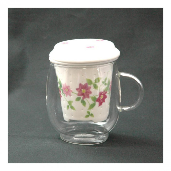 ガラスのマグカップに陶磁器の茶こしと蓋をセットしました。茶こしは底部が三つ脚になっており、マグカップに茶こしの脚を引っ掛け、熱いお茶の湯切りをすることができます。蓋は裏返すと茶こし受けとしてもご使用いただけます。ギフトにも最適♪ |
