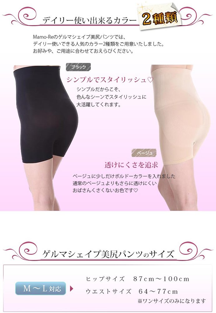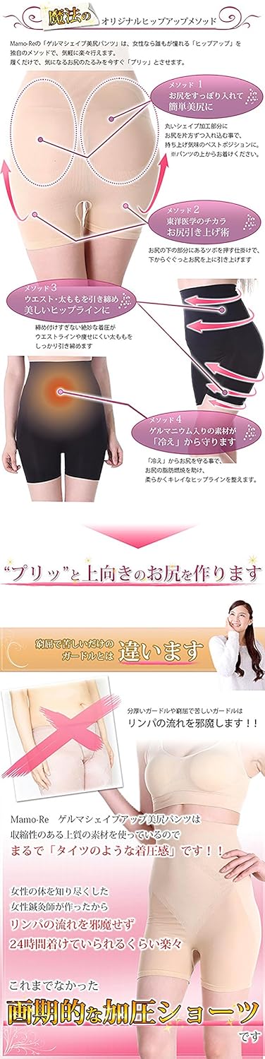 【サイズ】:M~L対応(ヒップ87~100cm・ウエスト64~77cm)【カラー】:ブラック・ベージュ【素材】:ナイロン85%・ポリウレタン15% ※生地にゲルマニウム配合女性の身体を知り尽くした女性鍼灸師、高田裕子先生設計のMamo-Reオリジナル、ヒップアップメソッド!睡眠時にもつけられる抜群の履き心地で、24時間サポートします!※着用感には個人差があります。